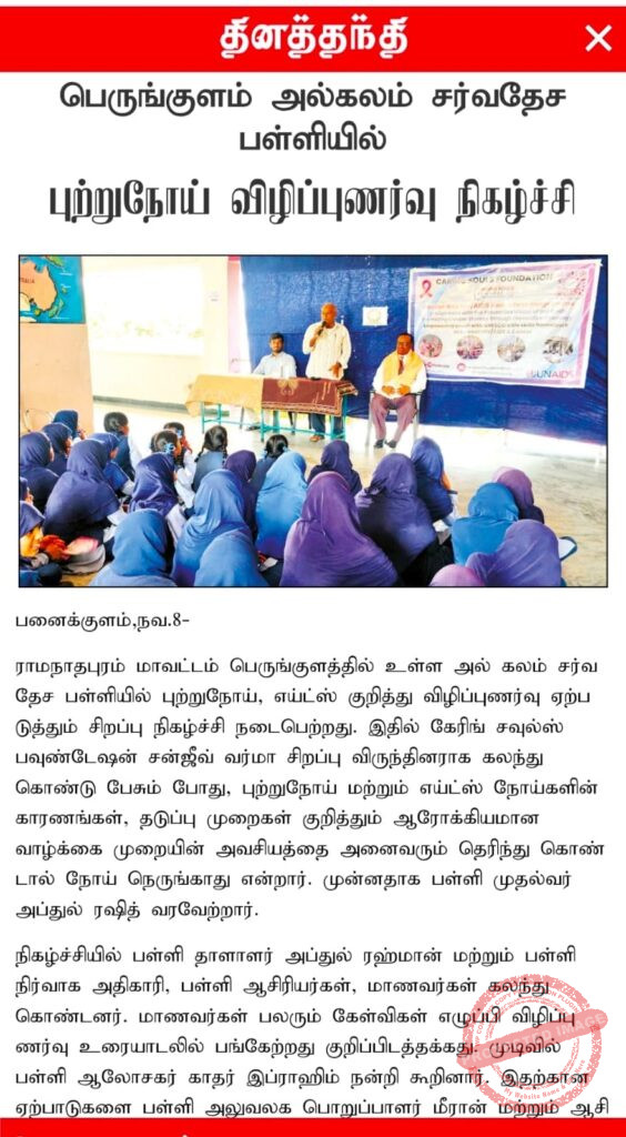 Al Qalam International School, Perungulam, was the venue for a vital awareness session today, focusing on the crucial topics of Cancer and AIDS prevention. The special guest for this empowering event was Mr. Sanjeev Varma from the Caring Souls Foundation.
